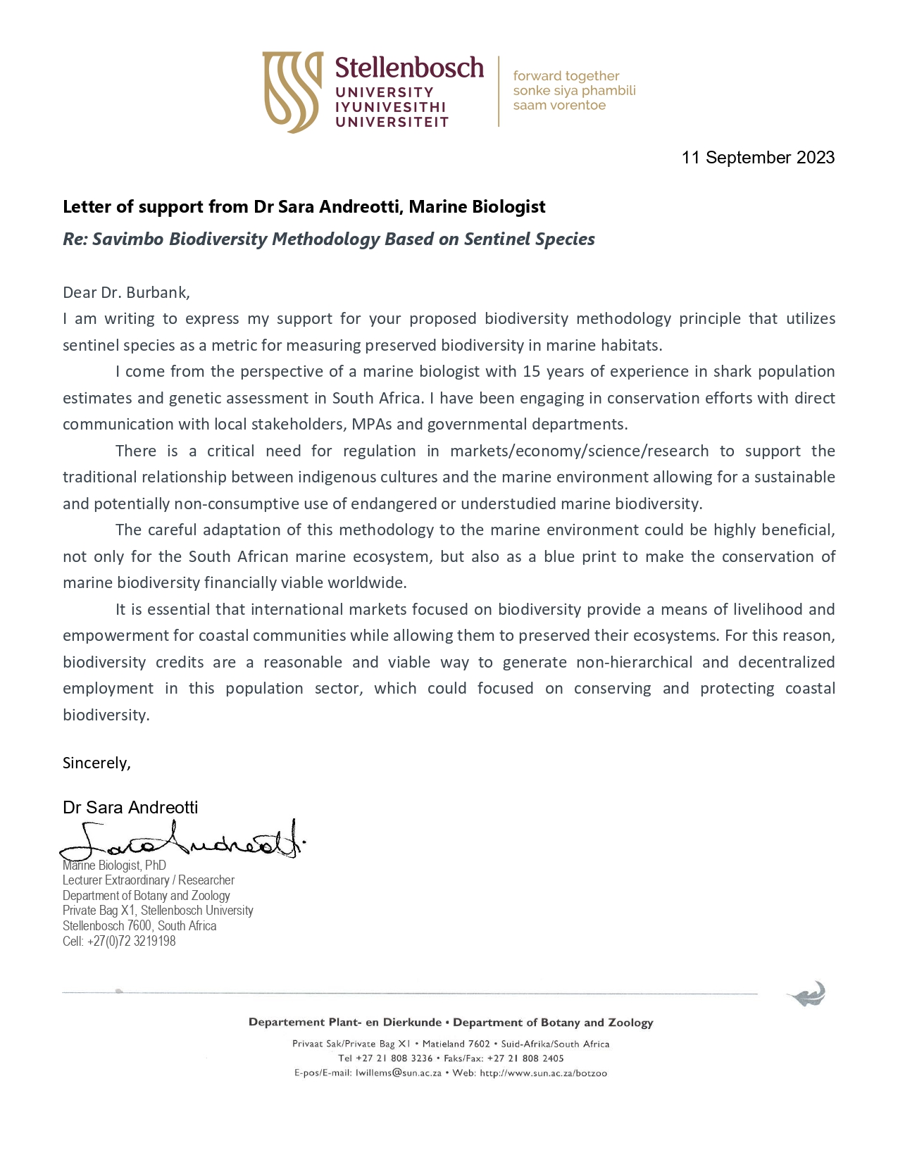 *Le escribo para expresar mi apoyo al principio de metodología de biodiversidad que propone, utilizando especies centinelas como métrica para medir la biodiversidad preservada en hábitats marinos.*